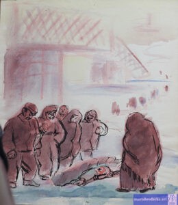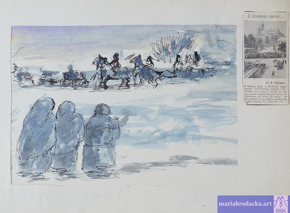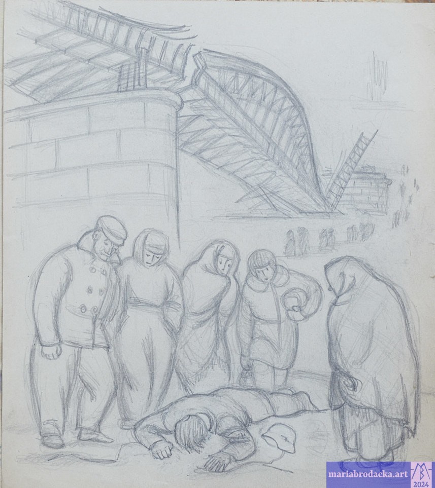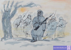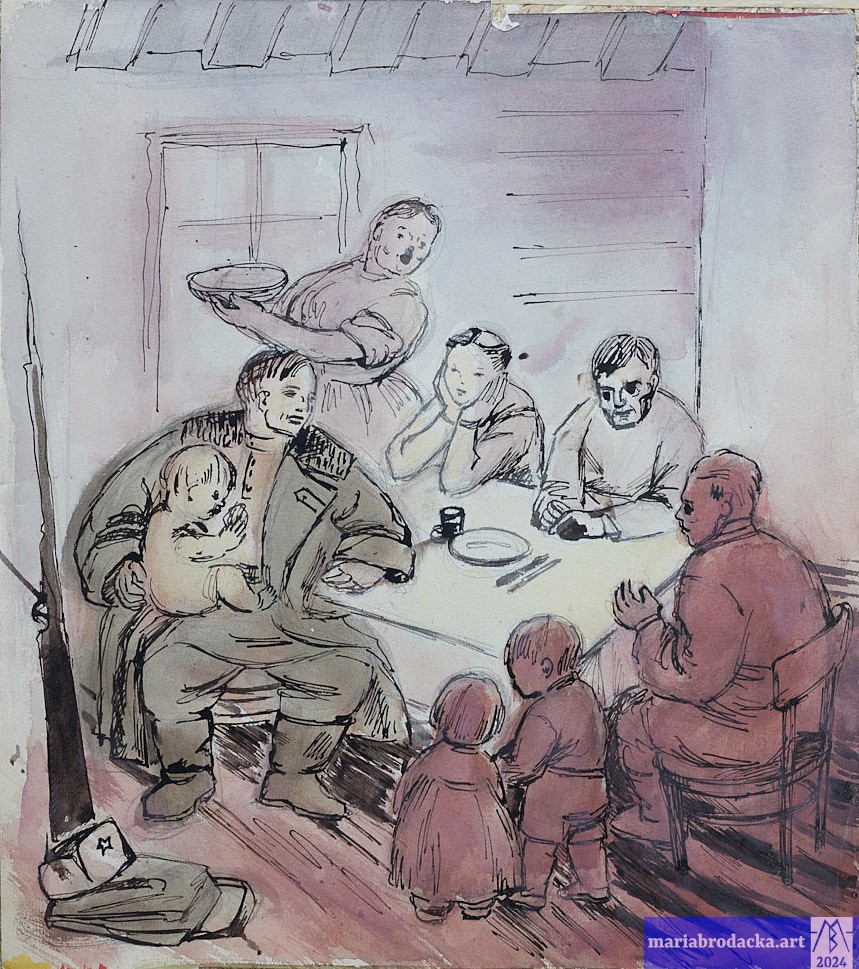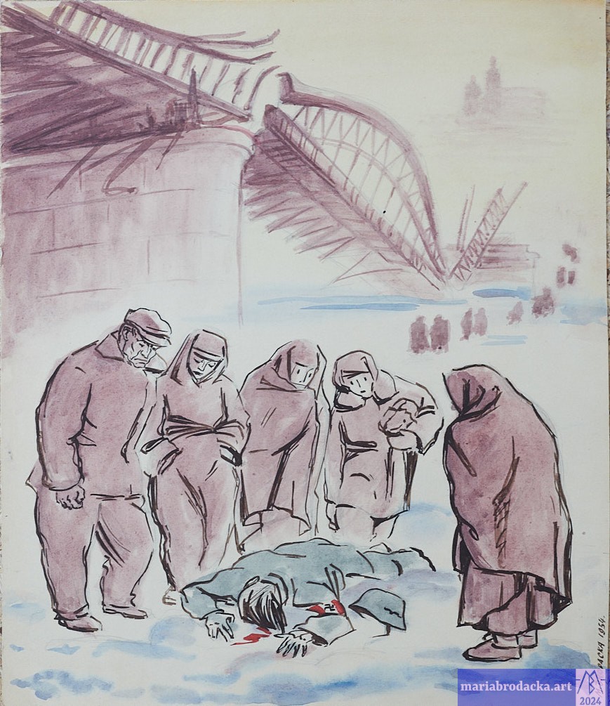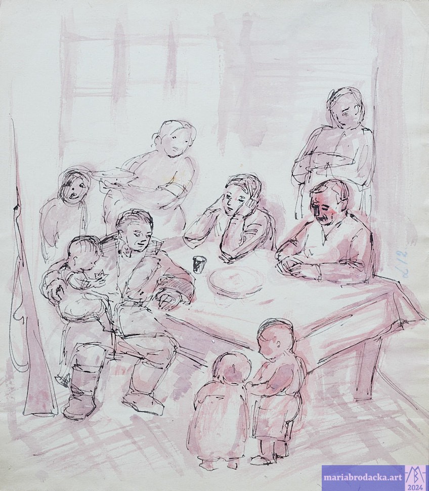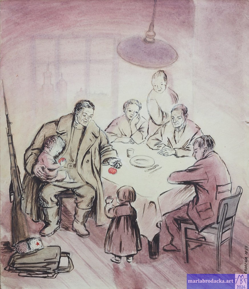 W tej zakładce prezentujemy niewielki zbiorek obrazków Marii Brodackiej o tematyce wojennej, czy raczej bezpośrednio powojennej. Ryciny mają wydźwięk ironiczny. Z jednej strony ukazują okrutną przeszłość okupacji, a z drugiej – nadciąganie ponurej przyszłości.