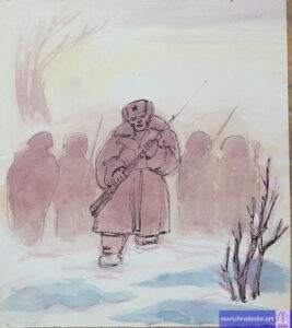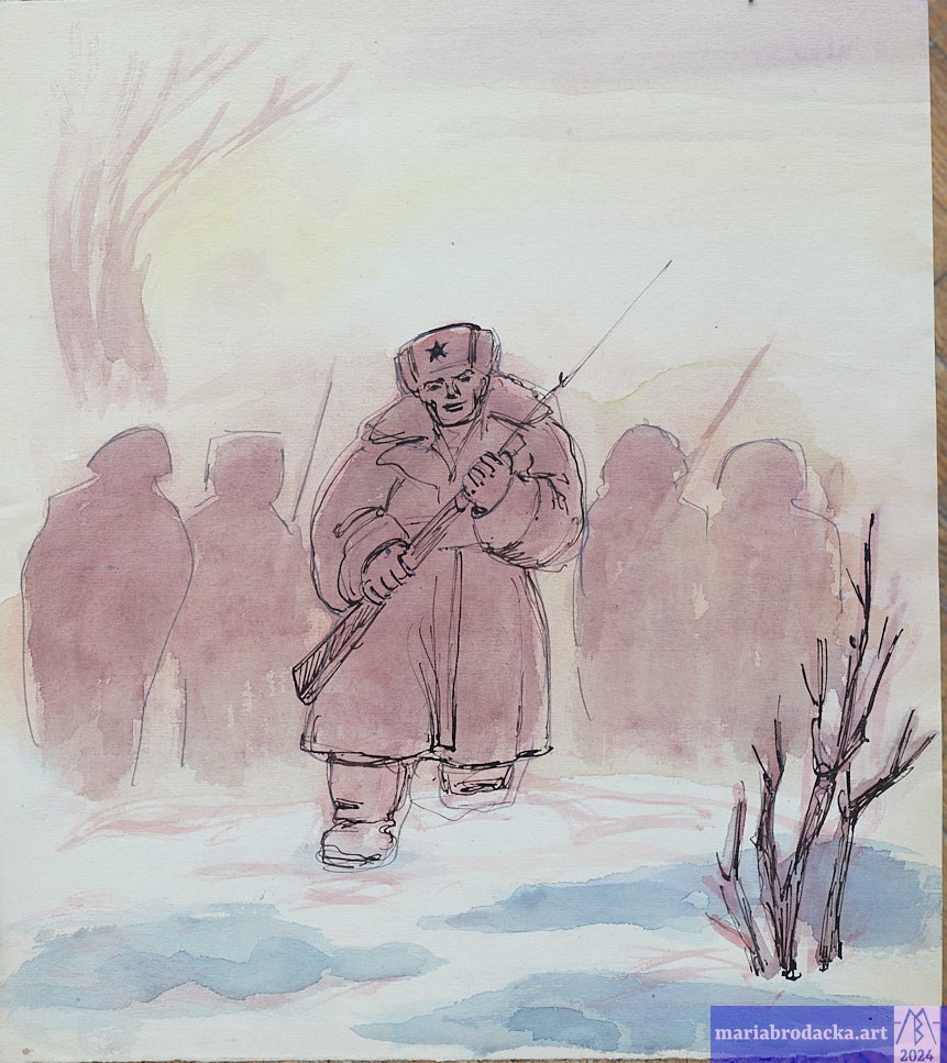 „Czerwony świt się z nocy budzi” (Jacek Kaczmarski). To nie tylko mróz, ale i przezorność nakazuje kobietom okutać się w bezkształtne szmaty, by ich atrakcyjność była ukryta przed okiem zdemoralizowanej „Rabocze-Krestiańskoj Krasnoj Armii”…