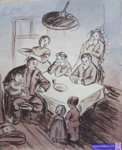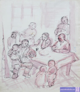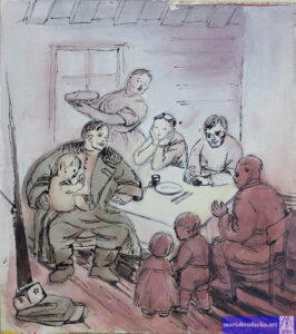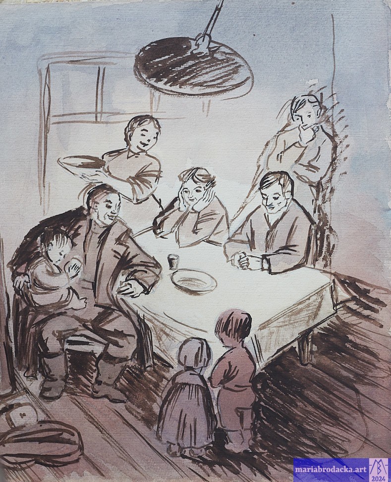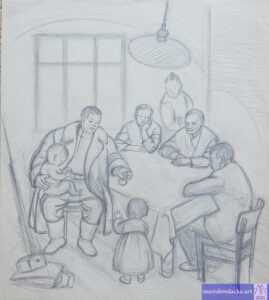 W jednym z wariantów rysunku z okna wyłaniają się wieże Kościoła Mariackiego w Krakowie. Raz twarze Polaków są radosne, innym znów razem spięte i bojaźliwe. Gość w dom, Bóg w dom, czym chata bogata… Prezentujemy je od szkiców aż do wersji końcowych.